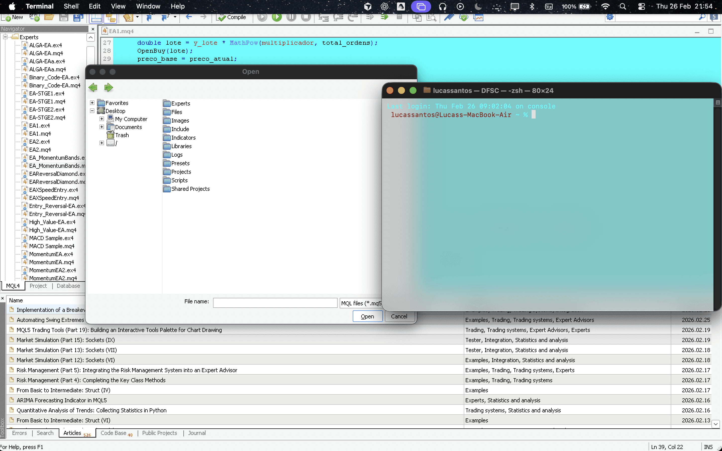 MQL4, Strategy Tester (backtesting, optimization), Historical data validation.